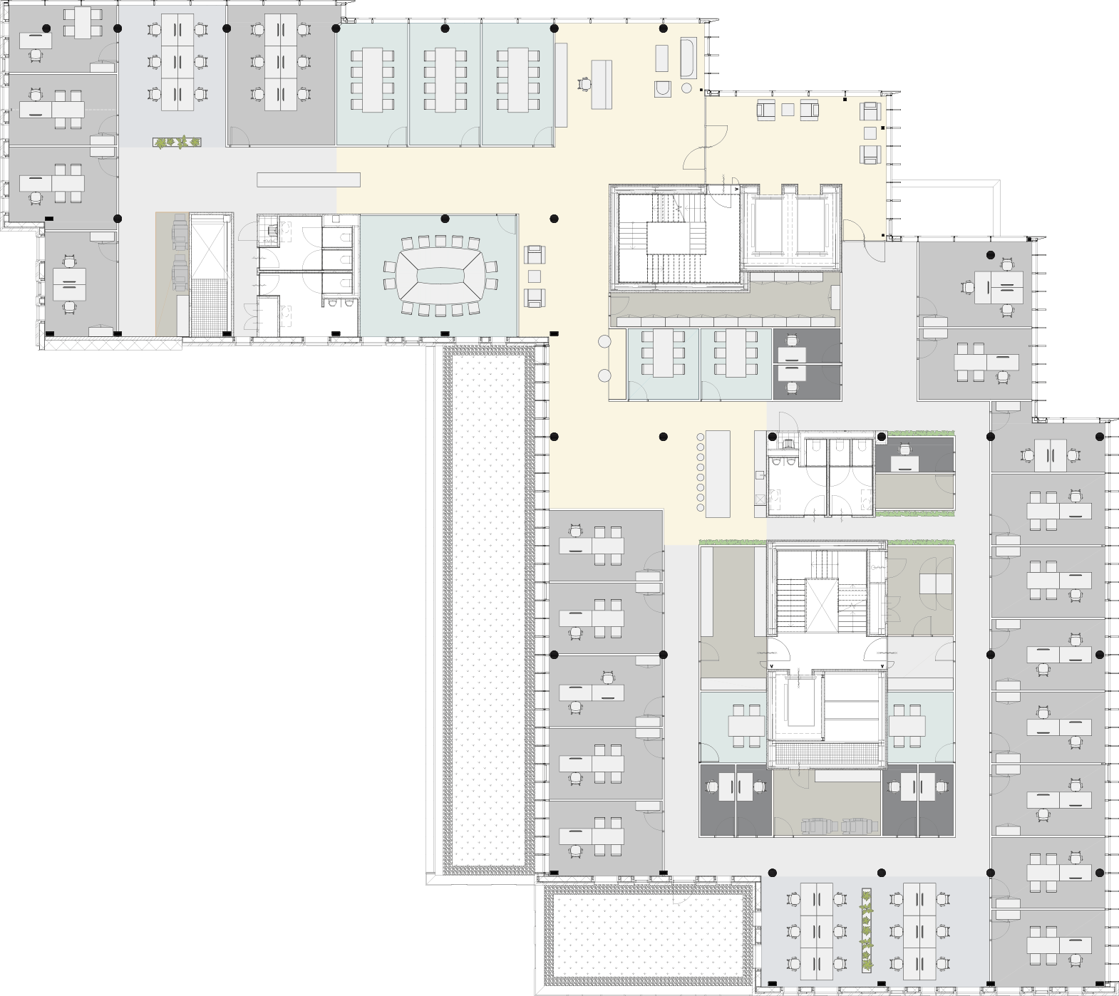 This traditional layout has closed office spaces that are positioned on the facade so that they optimally benefit from daylight.